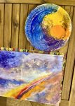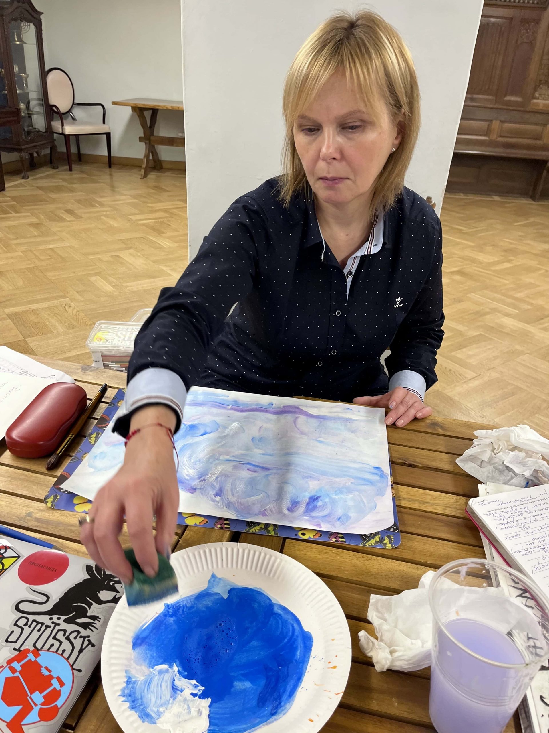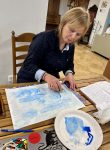 Каждый выбрал цвета для рисования вдохновляющего неба будущего. А затем акриловыми красками и губкой, закрасили фон. Потом мы рисовали облака пальцами рук, делая круговые вертикальные и горизонтальные движения. Эта работа завораживала, её хотелось продолжать и продолжать… Некоторые участники потом поделились, что хотели бы рисовать на ещё бОльшем листе.
