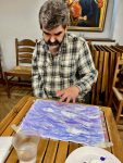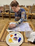 Затем каждый вигоровец выбрал одну желаемую краску и мы взялись расписывать резные яйца, передавая их по кругу. Таким образом каждый «приложил руку» к каждой работе. Задача была — продолжить работу, не нарушая задумки предыдущих творцов, добавляя при этом свой цвет.