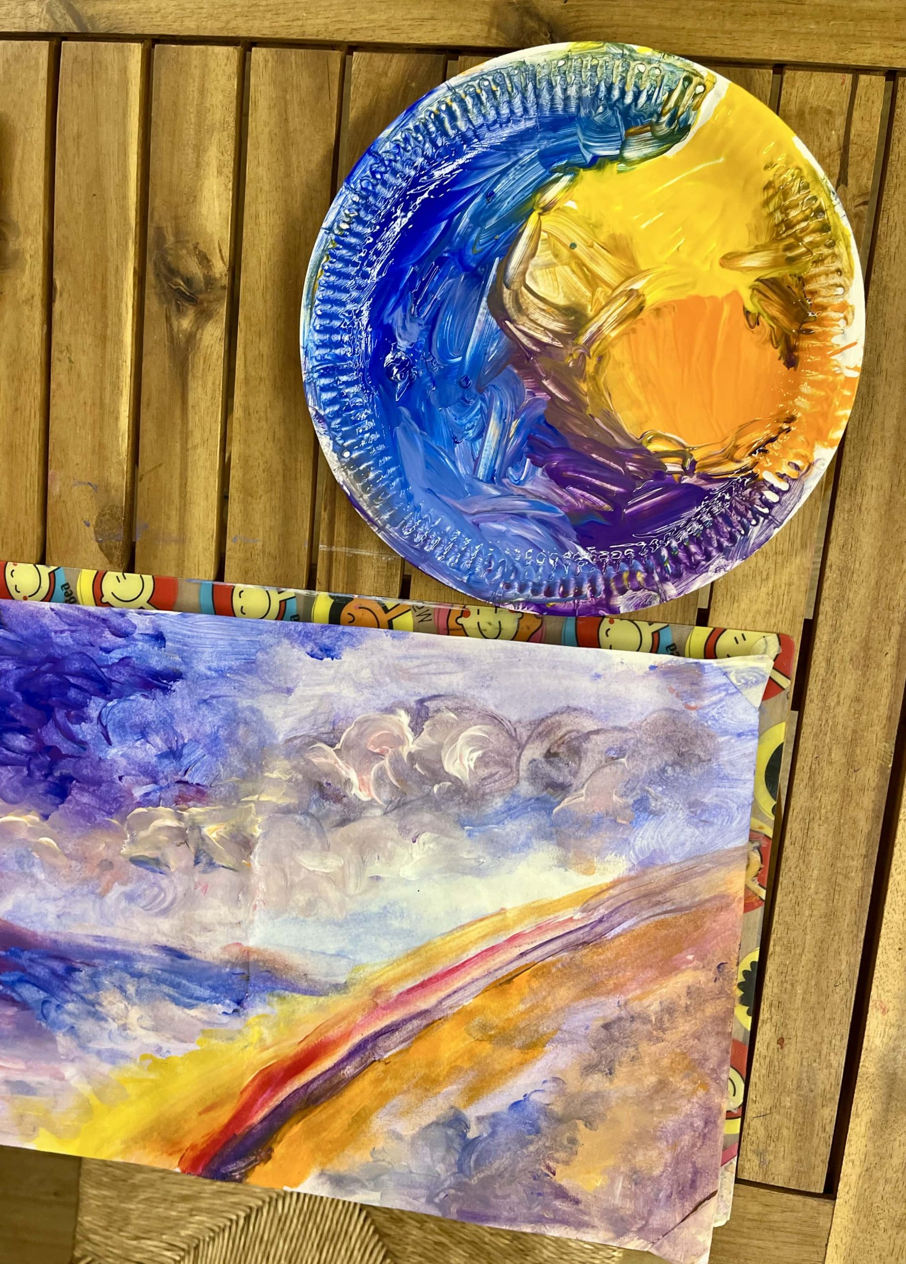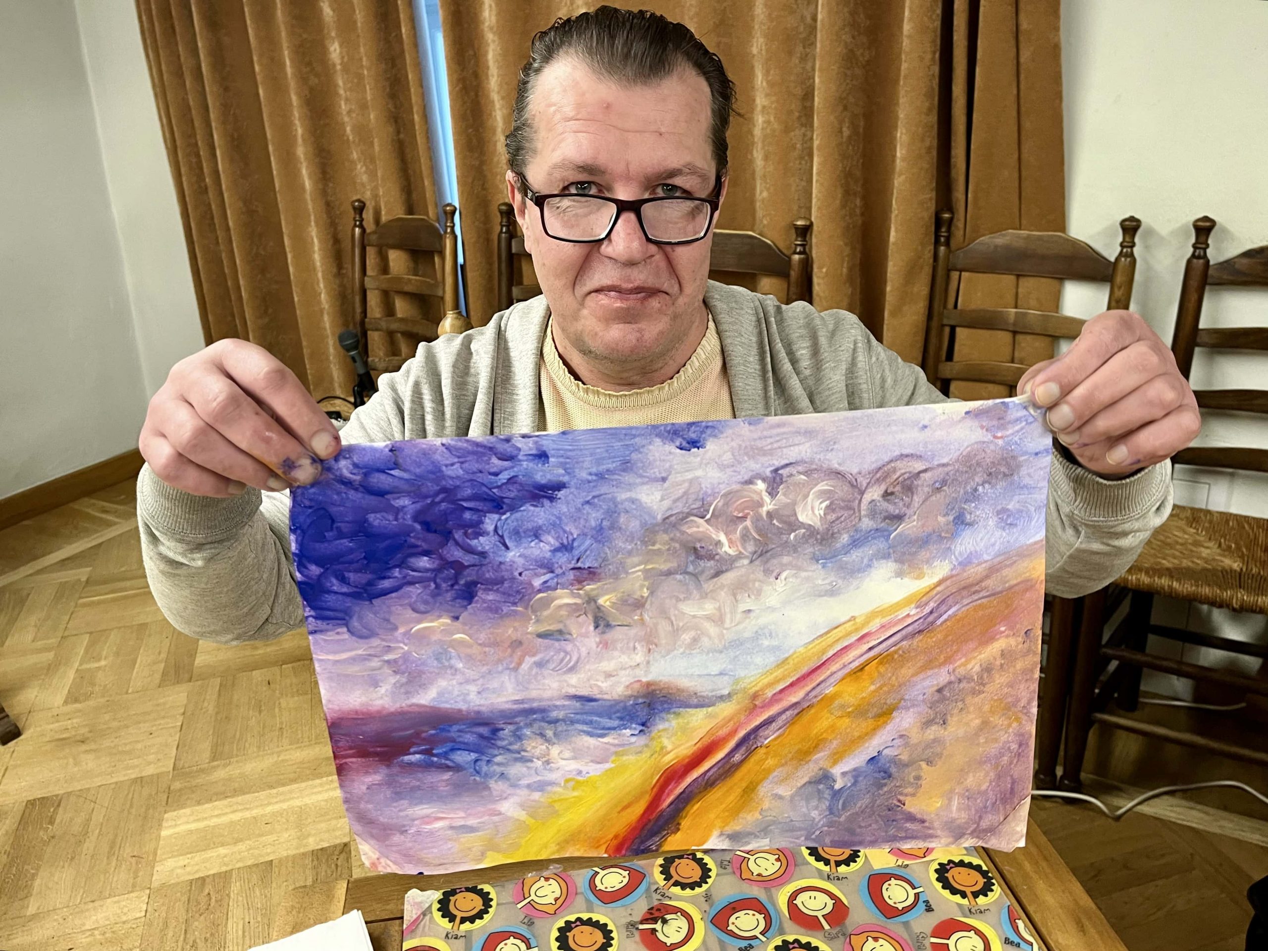 Работы получились яркими и выражали индивидуальность каждого. У каждого родились свои символы (радуга, шторм, лев на отдыхе, небесный букет выше крыши), которые снимали напряжение. Ощущение смешения цветов фантазией перевоплотились в развязку психологических узлов, снижая тревожность и улучшая настроение.